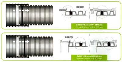 Геометрическая форма двухслойного профиля обеспечивает высокую сопротивляемость деформации. Гофрированные трубы выпускаются двух типов, которые отличаются по классу (SN) кольцевой жесткости (6 кН/м2 или 8 кН/м2), что дает возможность использования водопровода при подземной укладке на разных глубинах.